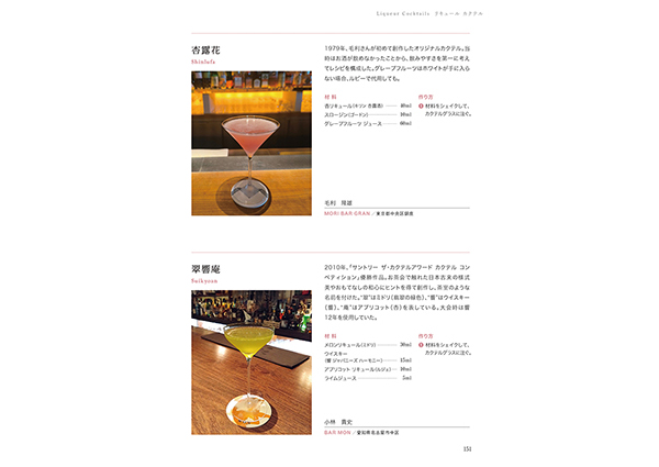 ●ジン カクテル ●ウォッカ カクテル ●ラム カクテル ●テキーラ カクテル ●ウイスキー カクテル ●ブランデー カクテル ●リキュール カクテル ●ワイン カクテル ●焼酎・泡盛・日本酒 カクテル/その他 カクテル ●カクテル創作とコンペティション審査について ●あとがき 【解説】 ・「雪国」「ソルクバーノ」「チャイナブルー」本当のレシピとは? ・ バーテンダーの協会(NBA、HBA、PBO)トップ3名による、カクテル創作とコンペティション審査について ・ カクテルコンペティション受賞作品レシピ ・ 今はもう会えない名バーテンダーたちのオリジナルカクテル ・ 全349作品のレシピを掲載 作られ、飲まれ、愛され続ければ、いずれスタンダードになる⋯⋯。 著者が実際にバーの扉を開き、味わってきたオリジナルカクテルの作品集。 基本的にシンプルな構成で、自家製素材を使わないレシピを紹介する。 時代の流れで材料の風味や好まれる味わいなどが変わり、 さらに美味しくなるよう研究されたレシピ。 いつかスタンダードになるかもしれないオリジナルカクテルは、 これからも進化し続けていく。 |